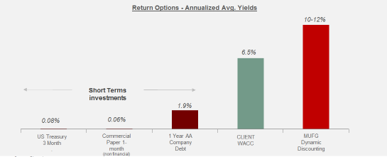 We have found that for our clients, implementing a dynamic discounting solution leads to a typical average annualized yield between 10%-12% APR, significantly outperforming most internal investment hurdle rates or returns on short term cash.